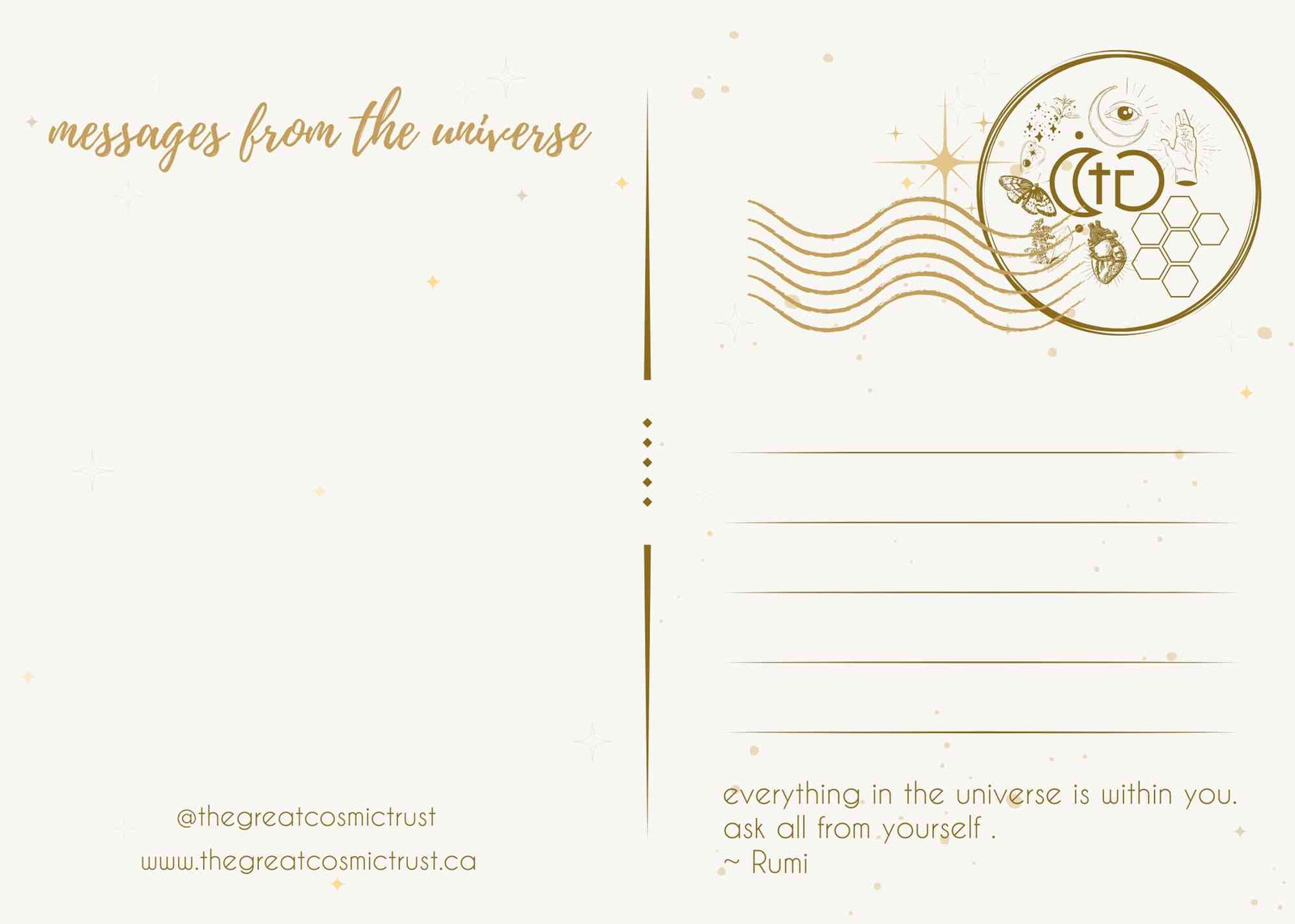 use the back of your card to write a message to you, from you. you make up part of the universe, after all! what message would you like to receive? what wish would you grant, if you could?